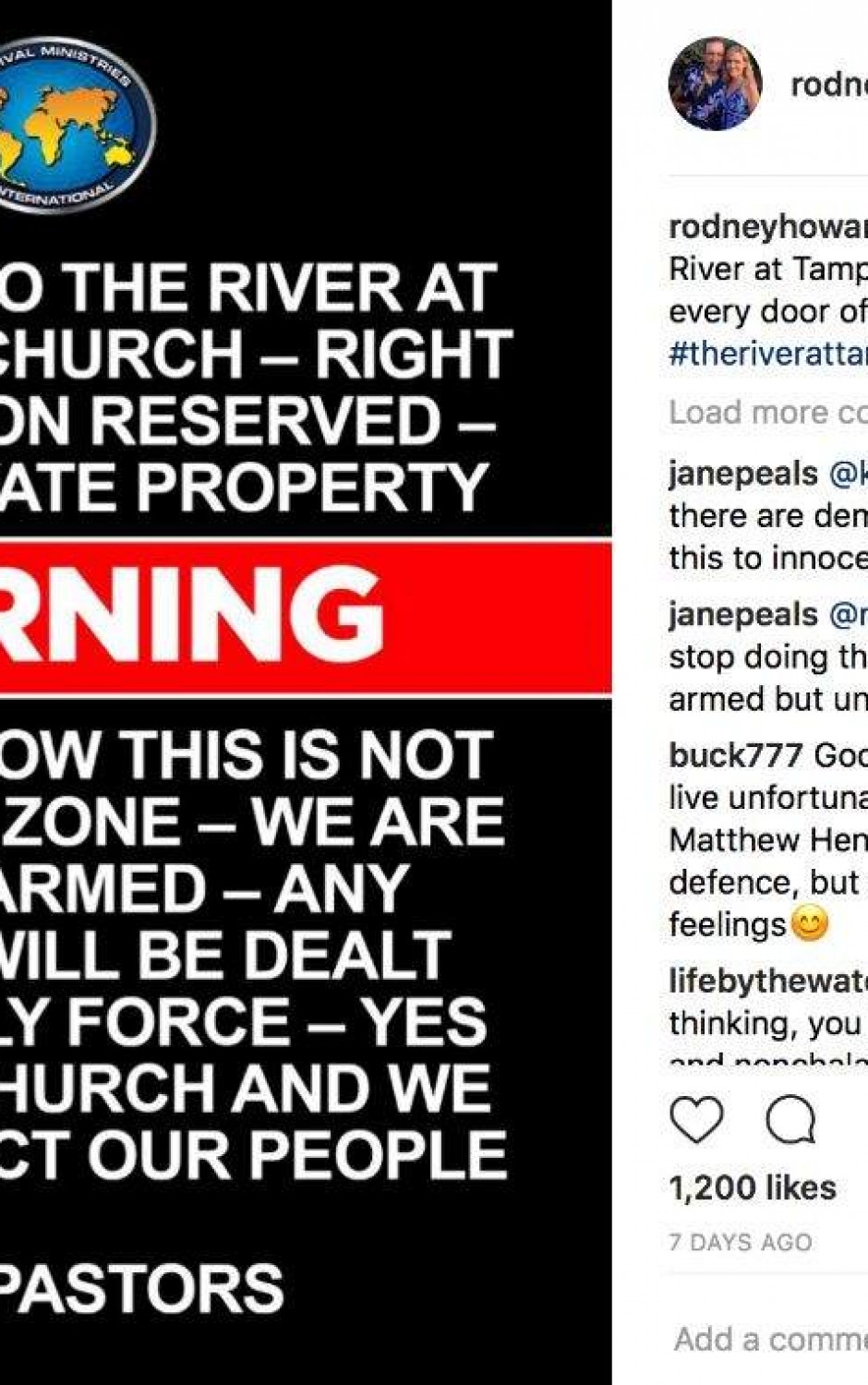 “Welcome to The River at Tampa Bay Church — right of admission reserved — this is private property,” it reads. “Please know this is not a gun free zone — we are heavily armed — any attempt will be dealt with deadly force — yes we are a church and will protect our people.” The message on the sign is signed “The Pastors.”